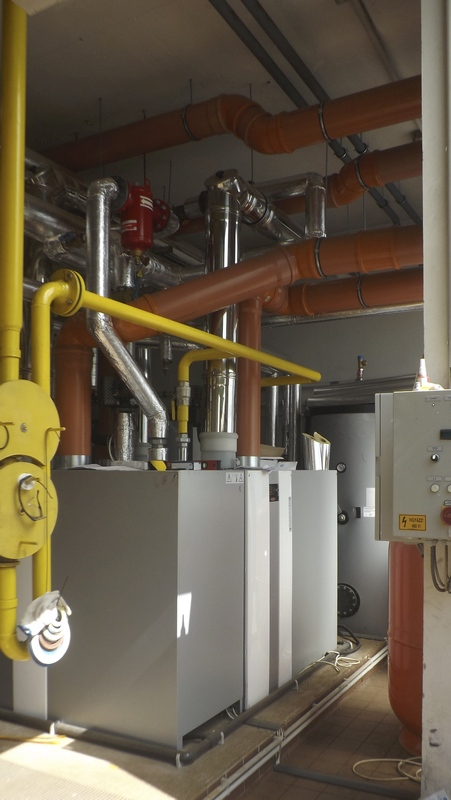 - a kazánházban lévő hagyományos atmoszférikus kazánok helyére korszerű kondenzációs kazánok kerülnek, amelyek az épületegyüttes fűtési melegvízén kívül felmelegítik az uszoda pótvizét és előállítják a használati melegvizet,